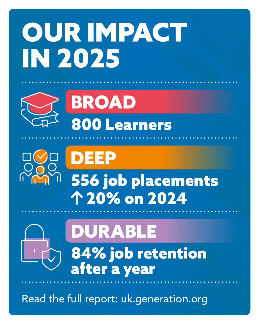 Download the reportOur new annual report showcases the progress Generation UK made in 2025 toward our 3-year strategic ambitions: deepening our impact, remaining agile to employer demand, investing in our people, and building the foundations for future scale.