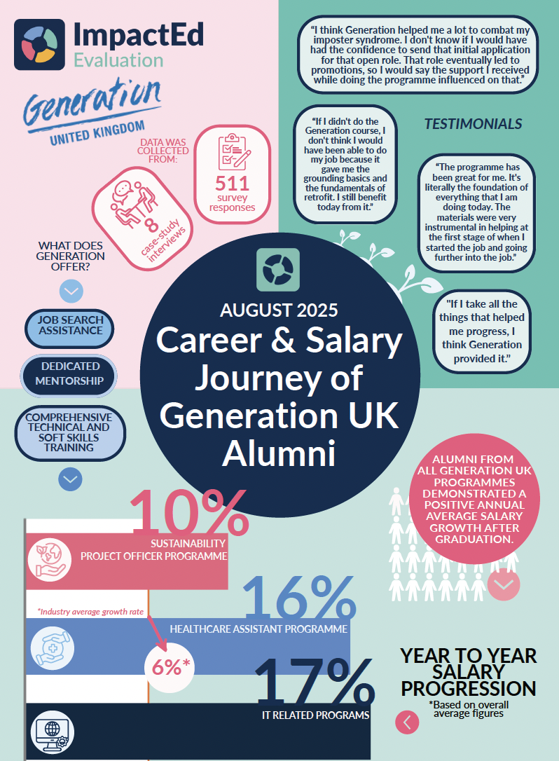 - Alumni widely identified Generation UK’s holistic support as the crucial “first-step” in their career journeys, from technical skills development through to job search assistance.